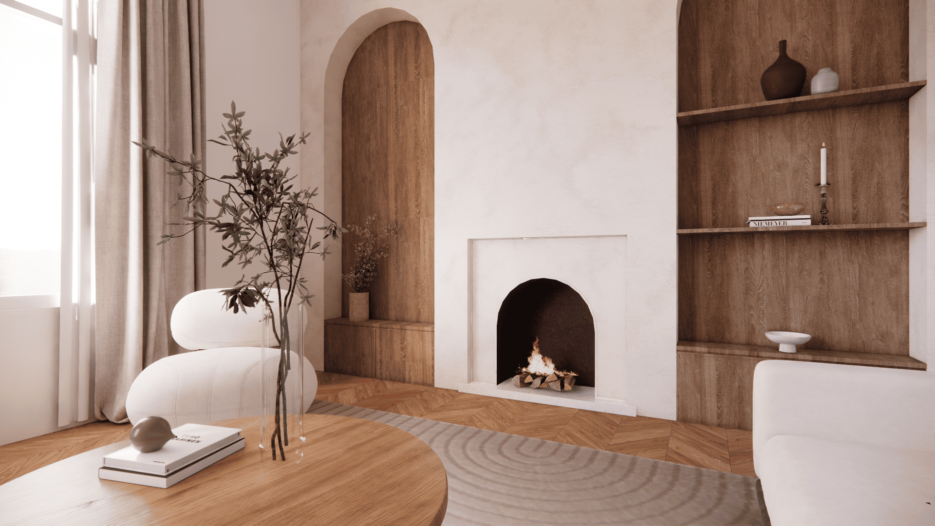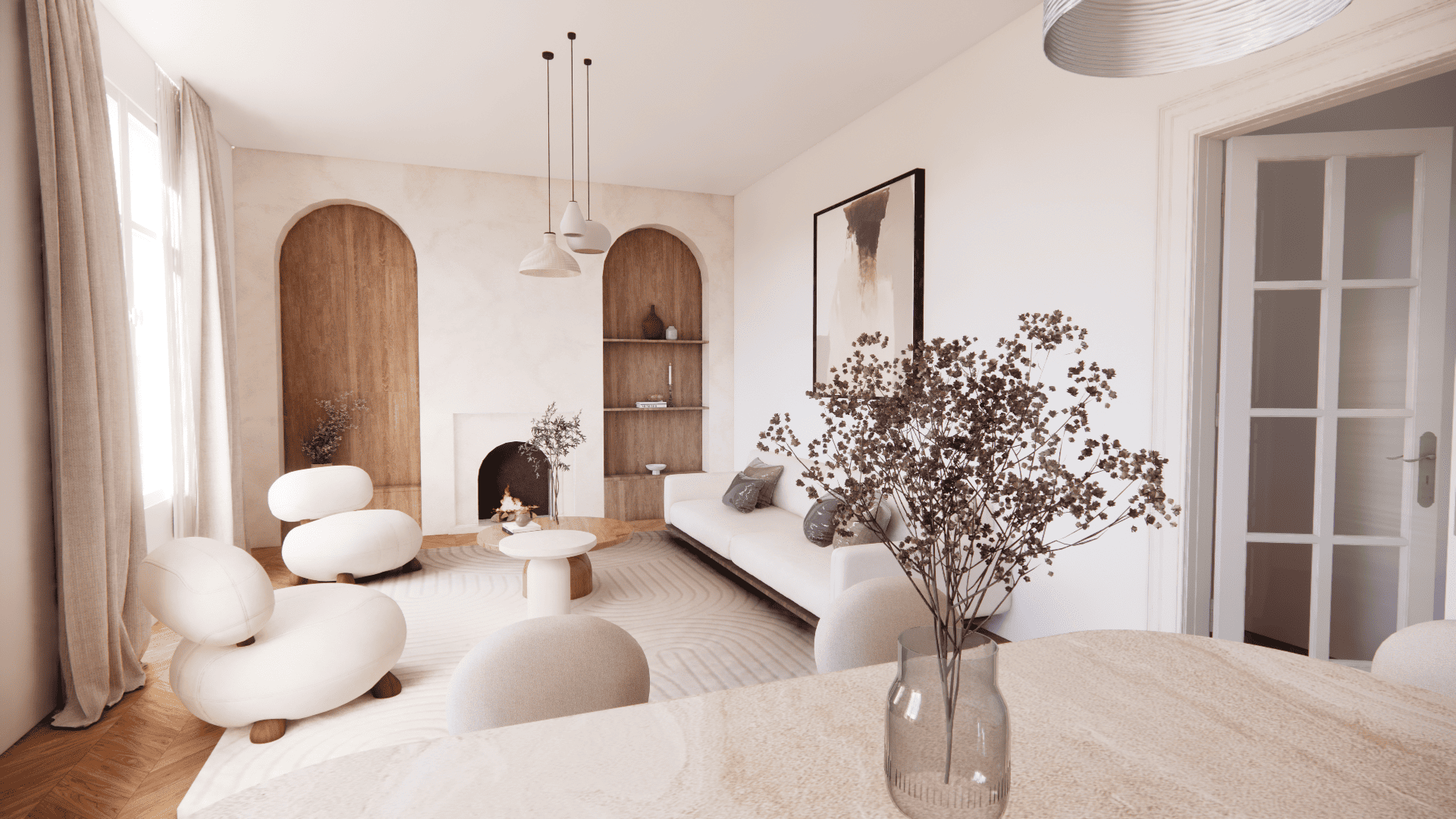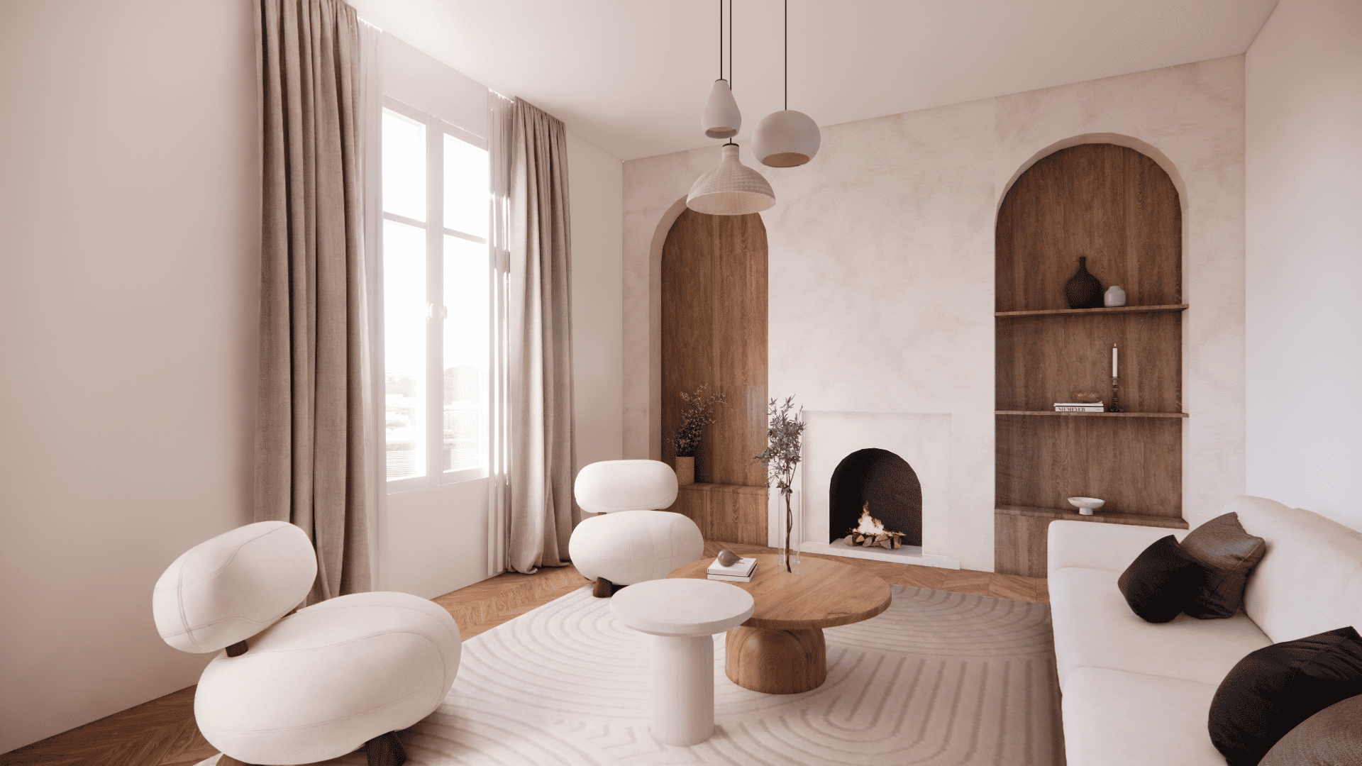 Pour la partie salon, l’espace s’articule autour d’un duo de niches habillées de bois, intégrées dans un mur en finition texturée, qui encadrent une cheminée décorative au design minimaliste. Ce dispositif architectural donne une vraie identité à la pièce tout en apportant de la profondeur visuelle.