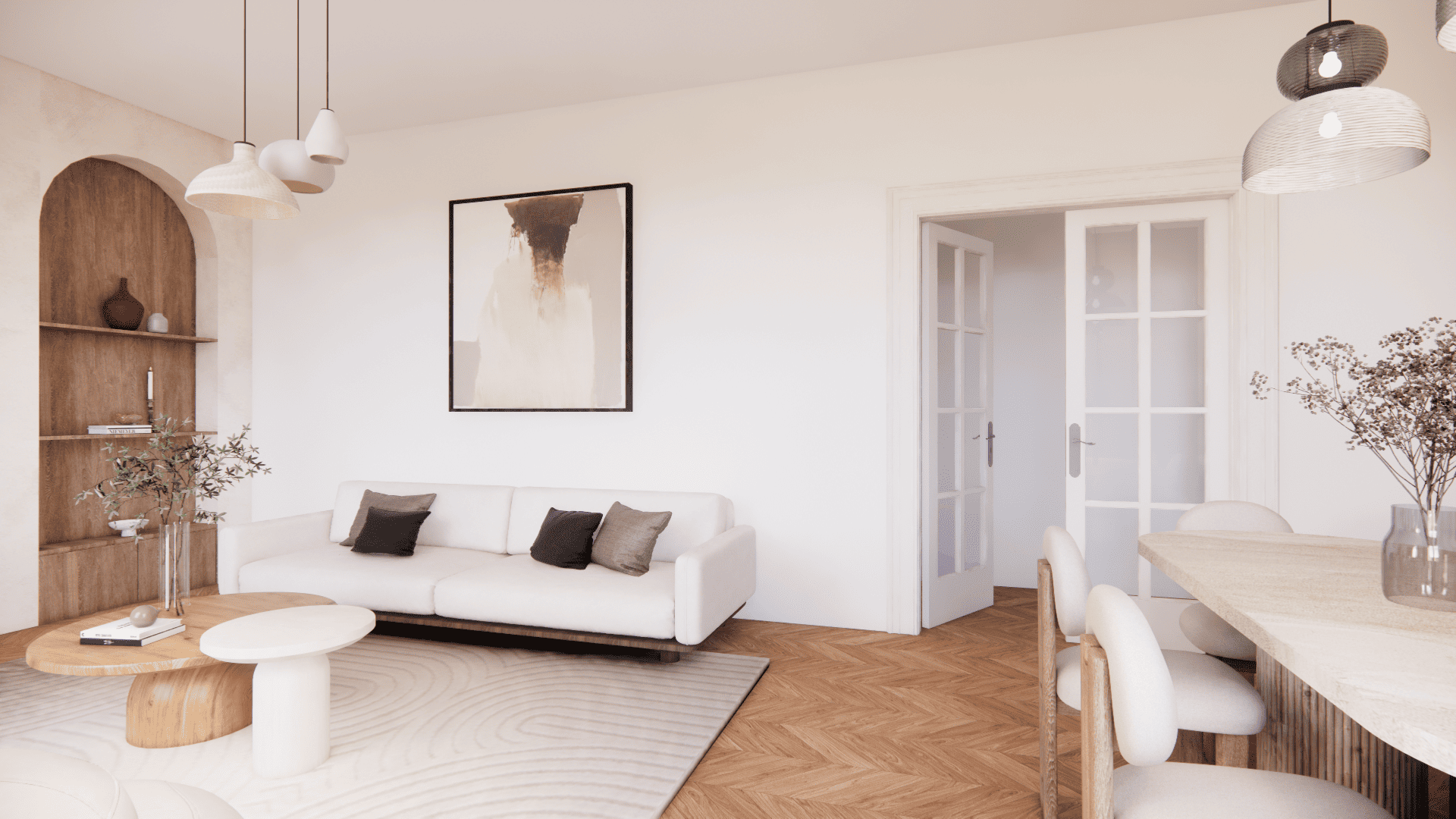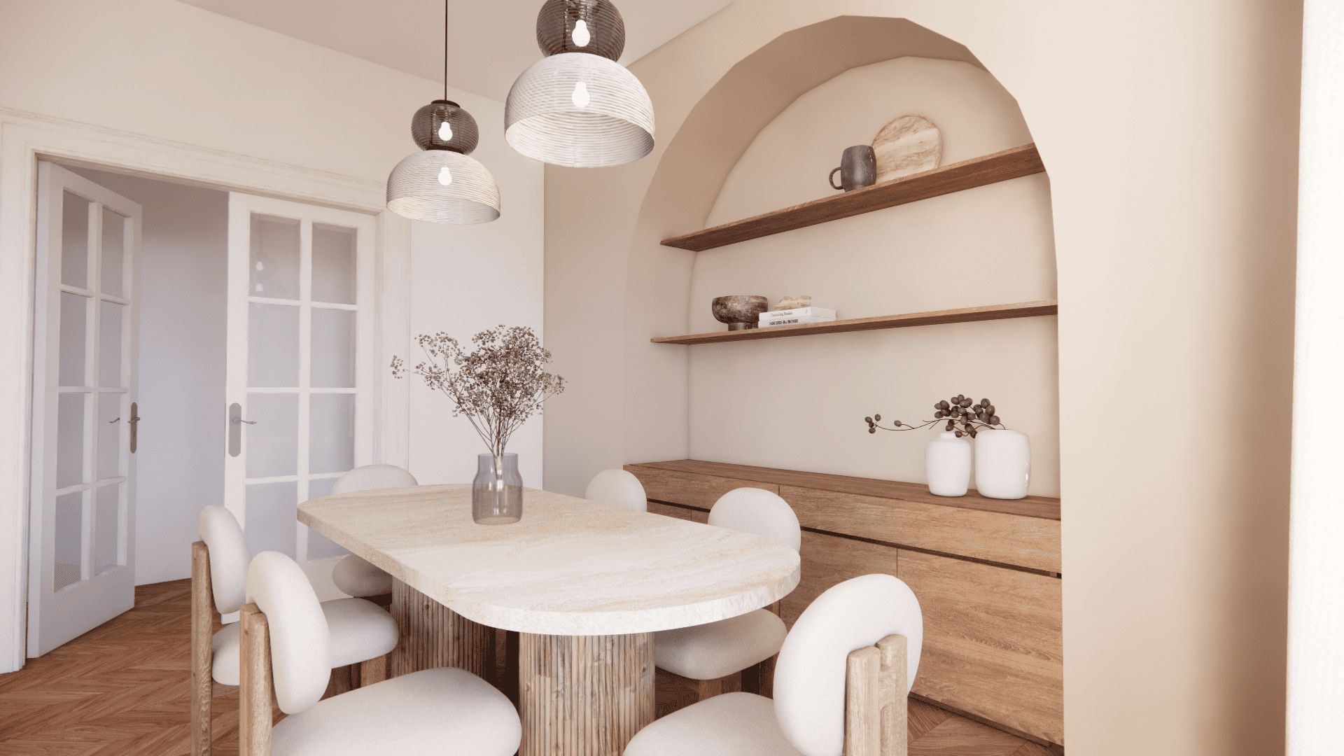 Dans le prolongement naturel du salon, la salle à manger s'organise autour d'une table ovale en pierre, dont la douceur des courbes dialogue avec la chaleur du bois. Au-dessus, deux suspensions diffusent une lumière douce et structurent l’espace avec légèreté.