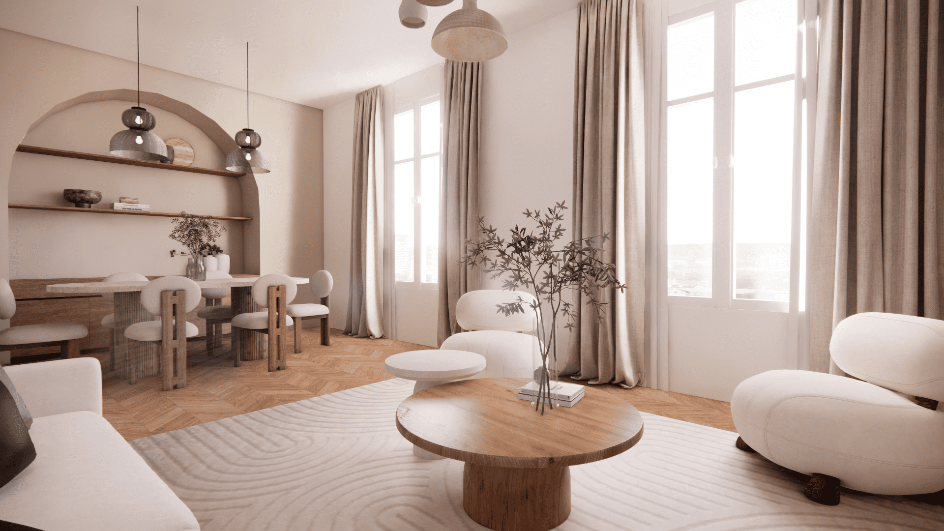Le mobilier, aux formes arrondies et accueillantes, joue la carte du confort. Le choix de tissus clairs et naturels s’accorde à une palette de tons neutres, créant une ambiance lumineuse et feutrée.